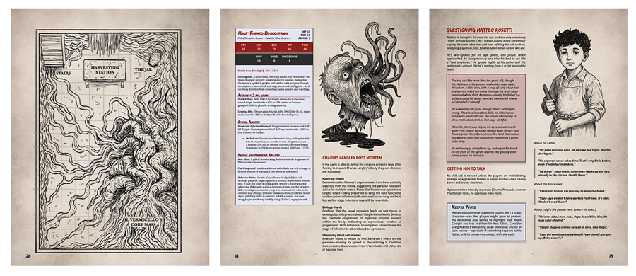 Original NPC and creature artwork in a vintage Call of Cthulhu line art style